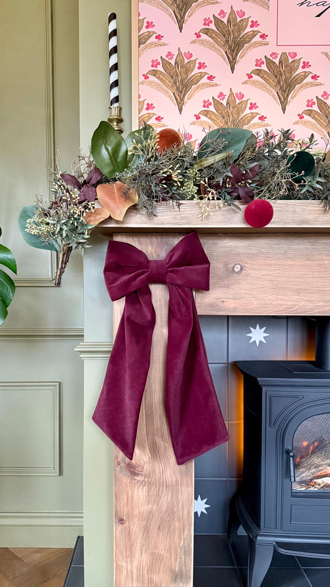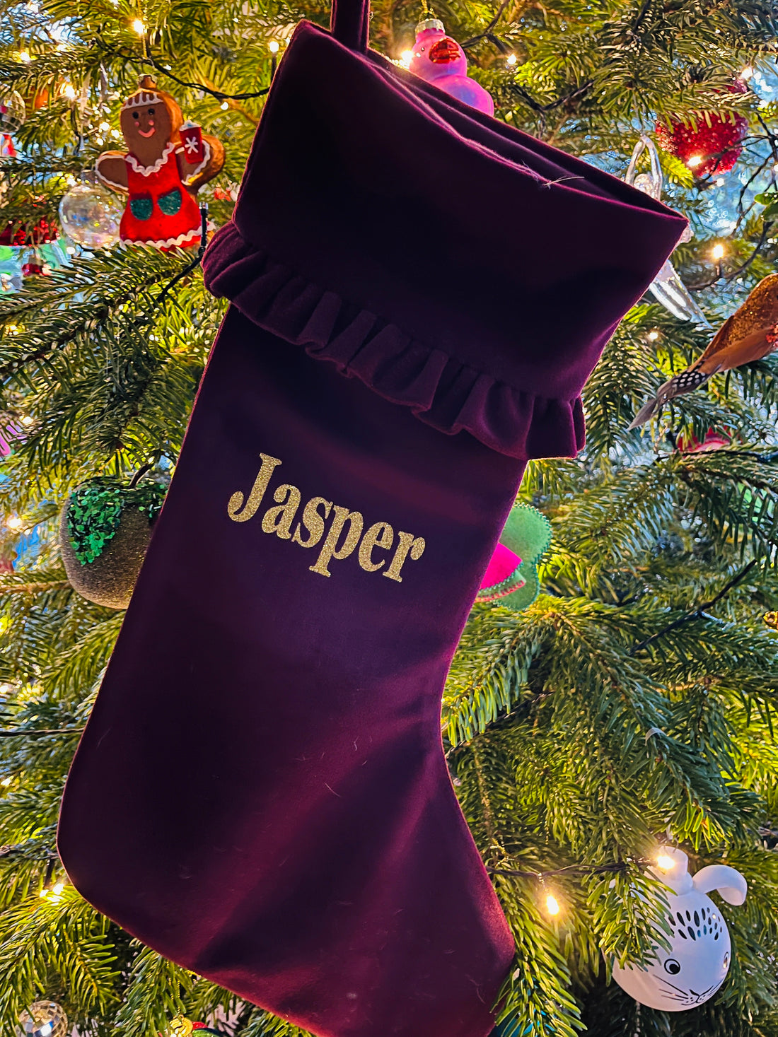 Luxury Burgundy Velvet Stocking with Ruffle & Gold Personalisation