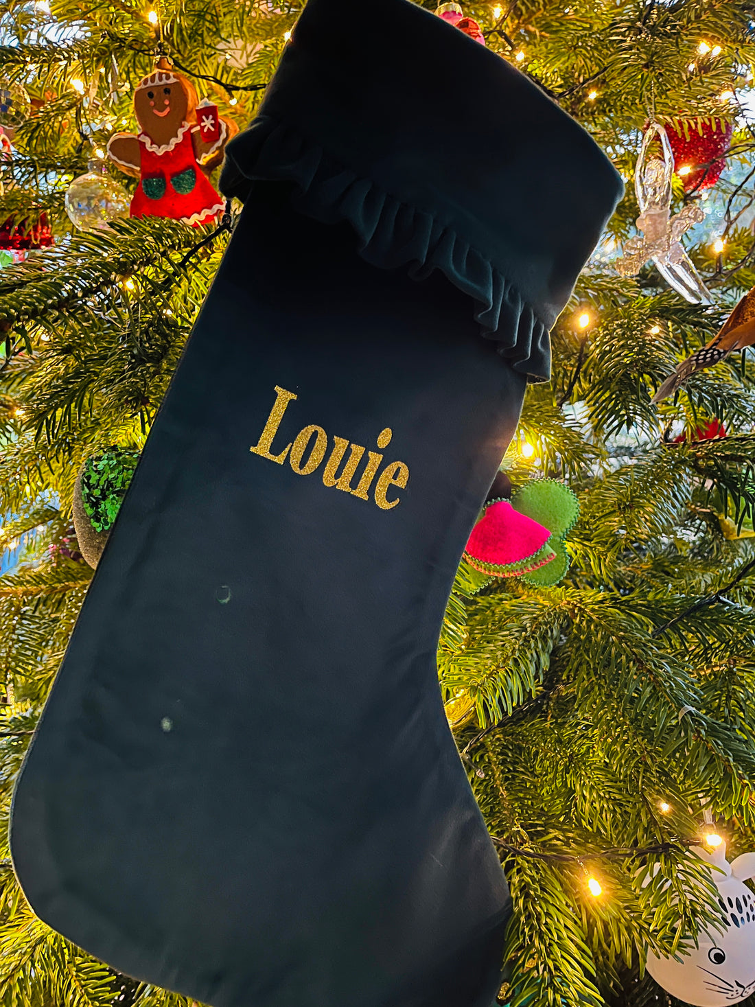 Luxury Forest Green Velvet Stocking with Ruffle & Gold Personalisation