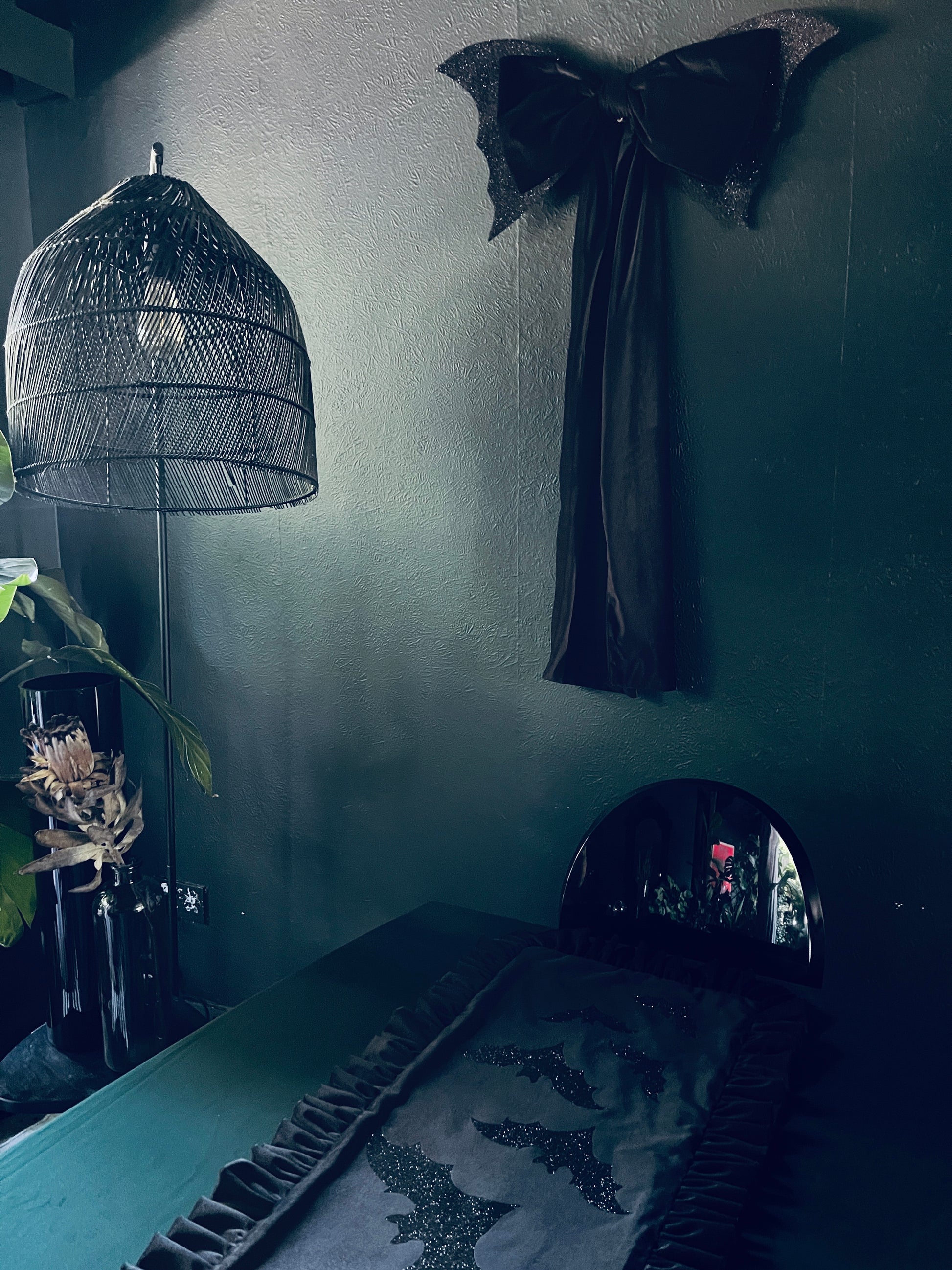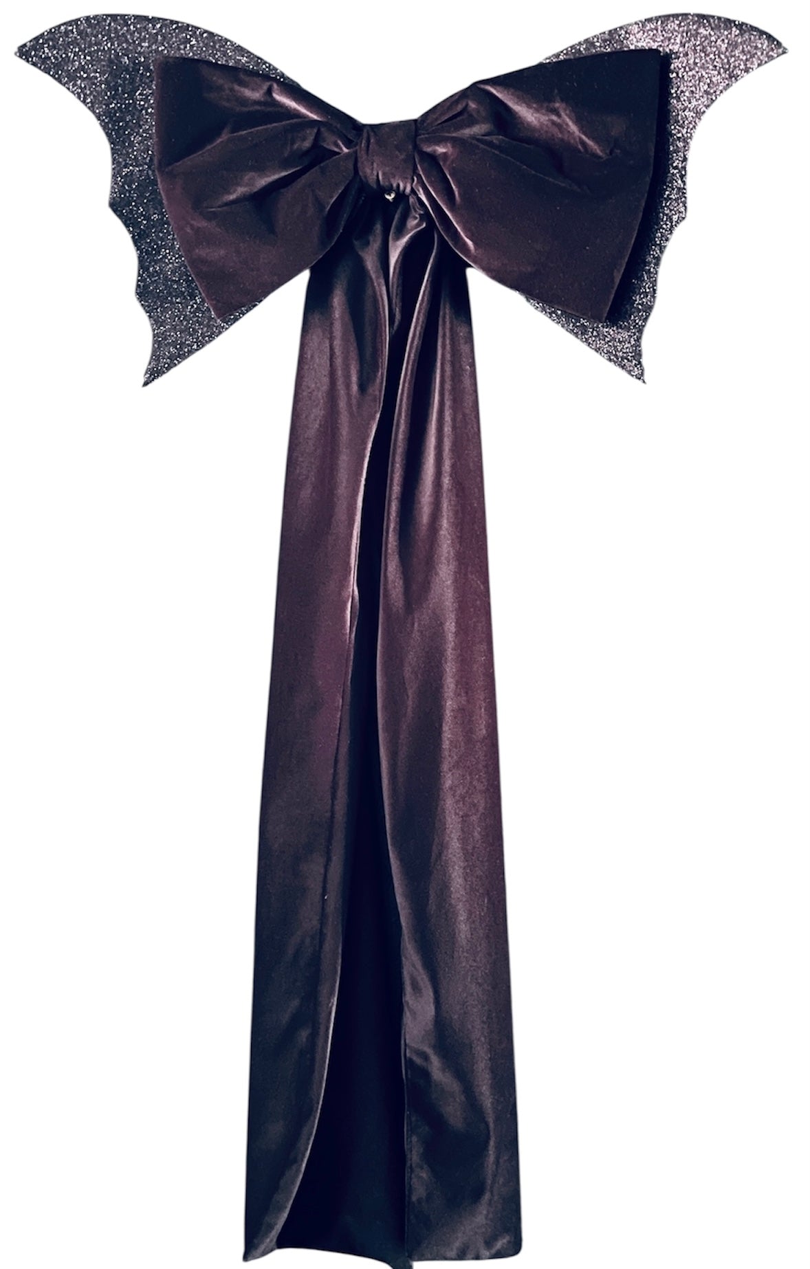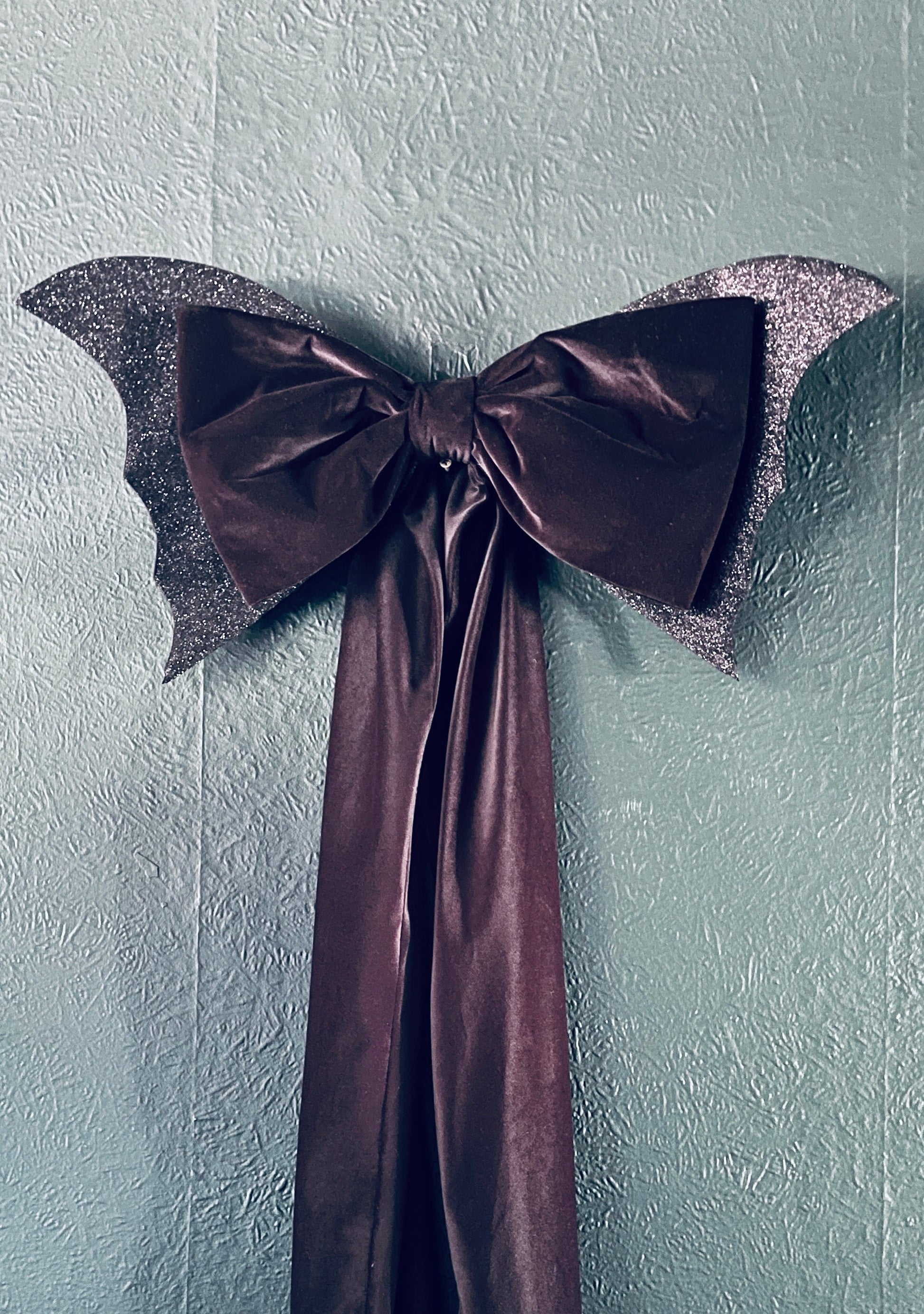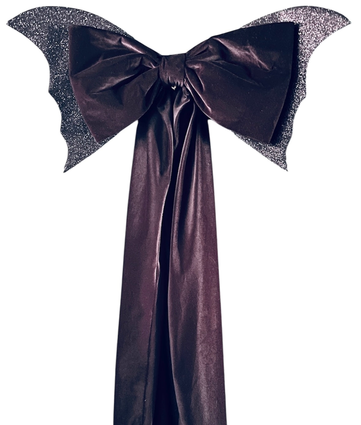 Crafted from luxurious, soft black velvet, this massive bow commands attention with its generous size and rich, deep texture. It's a striking silhouette on its own, but the true magic lies in its wings. Two intricately designed bat wings, adorned with a mesmerizing black glitter, stretch out from the sides, catching the light with a subtle, gothic shimmer.