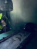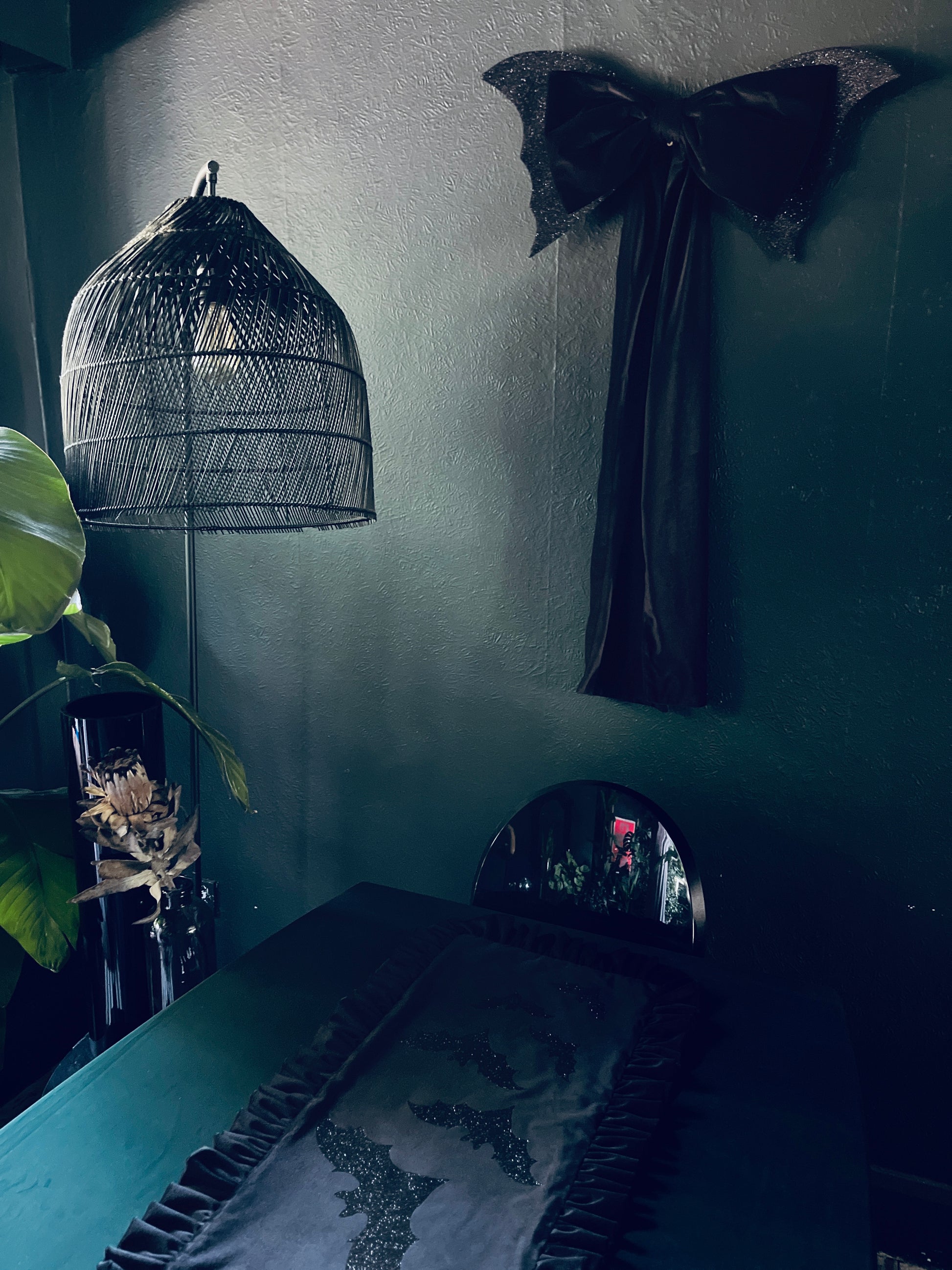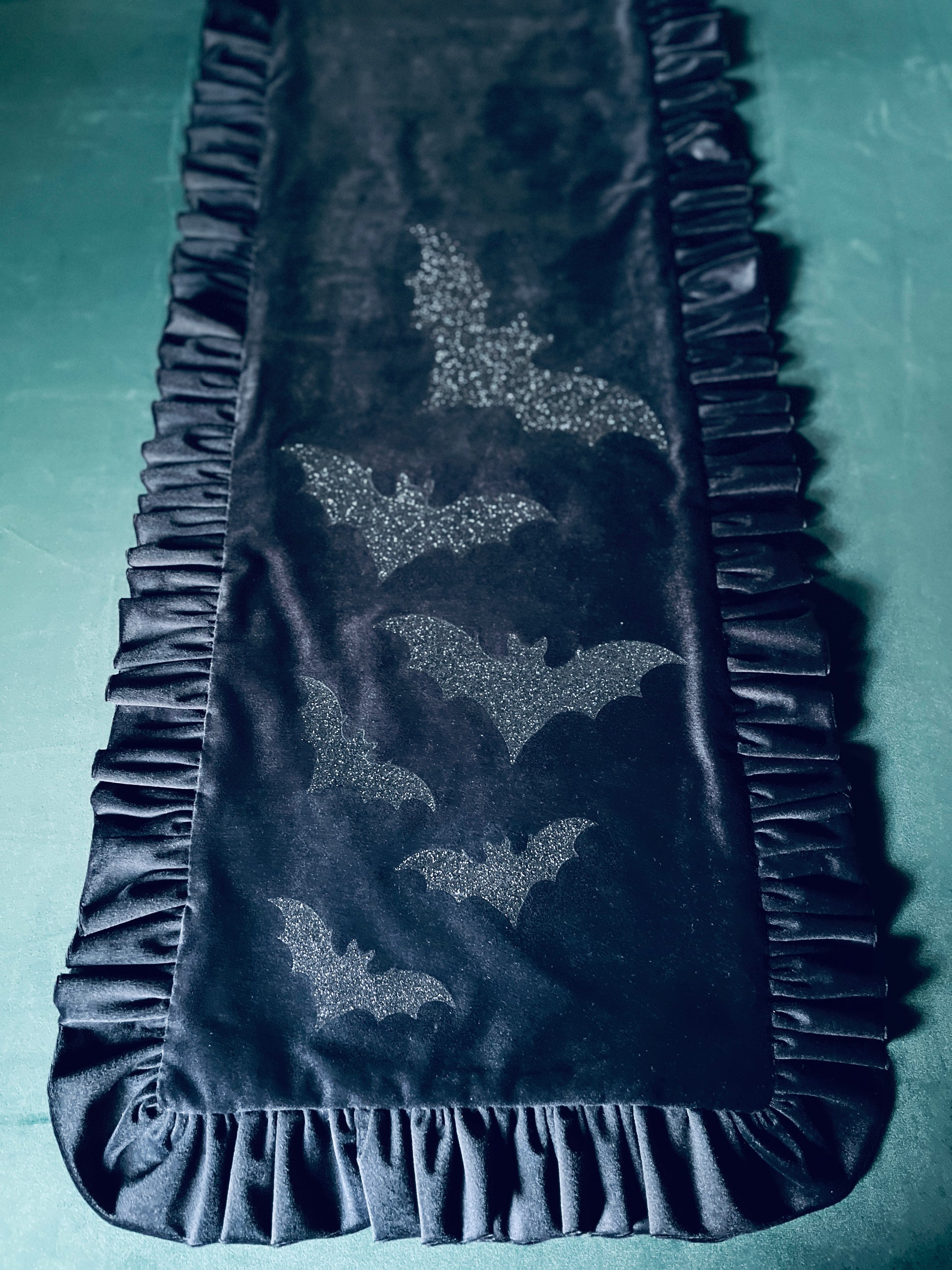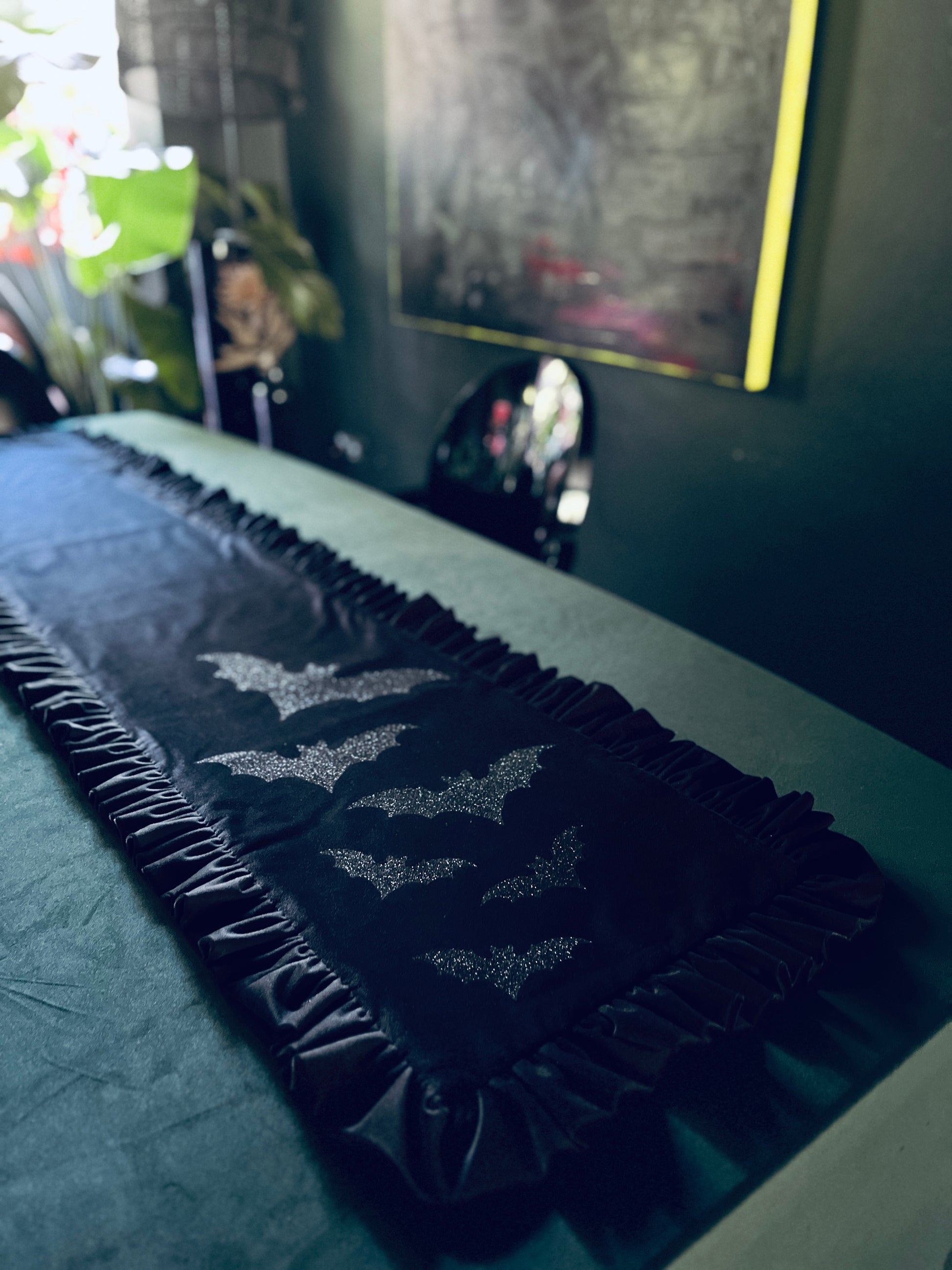 Crafted from rich, deep black velvet, this runner drapes across your table with a luxurious feel and dramatic presence. A whimsical ruffle edge runs the full length, adding a touch of old-world gothic charm. The true magic lies in the details: a series of glitter bat appliqués shimmer across the fabric, catching the candlelight with a subtle, haunting glow.