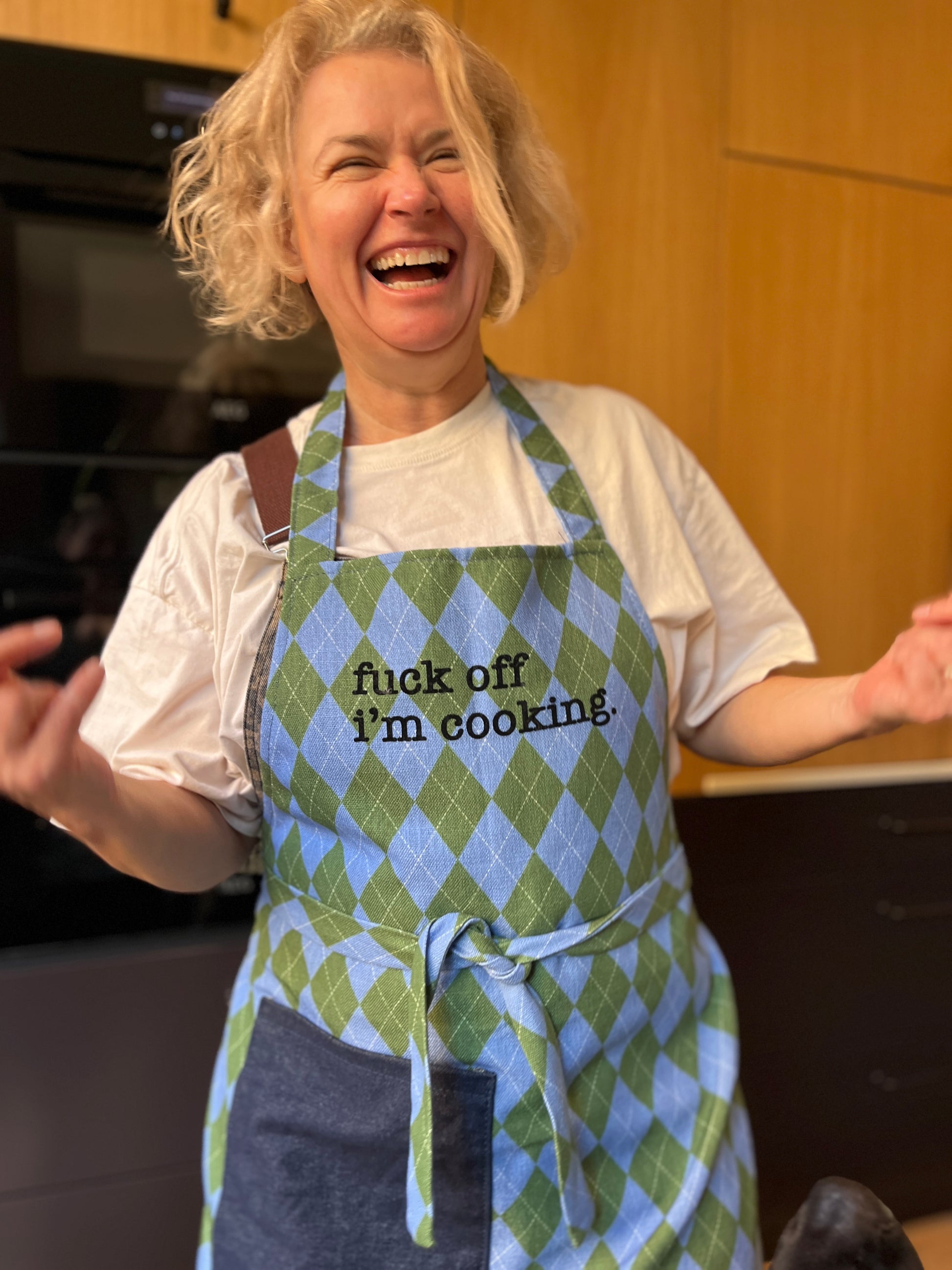 BLUE & GREEN ARGYLE APRON / DENIM POCKET WITH CUSTOM TEXT 'FUCK OFF I'M COOKING'