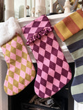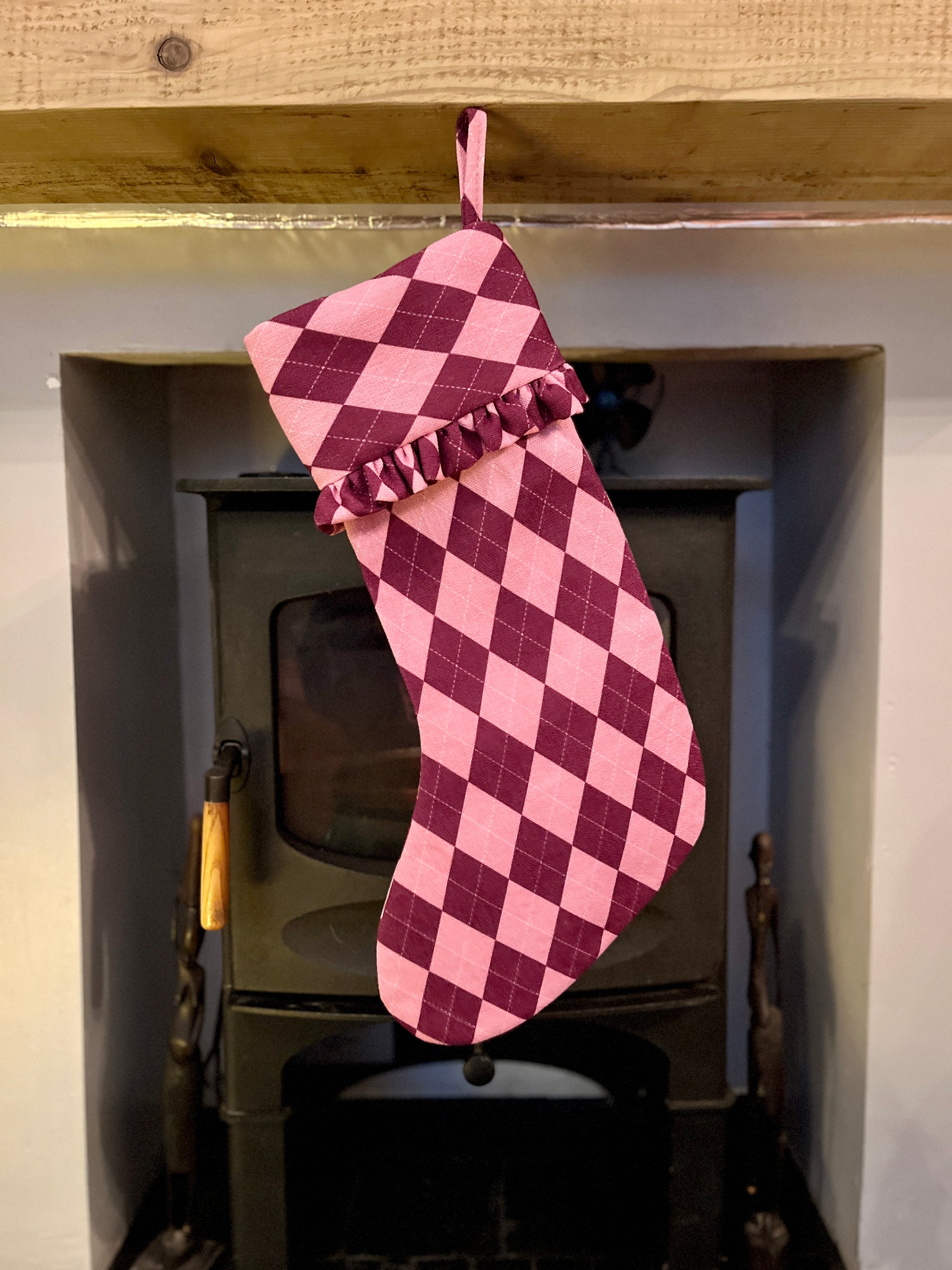Pink & Burgundy Argyle Ruffled Christmas Stocking
